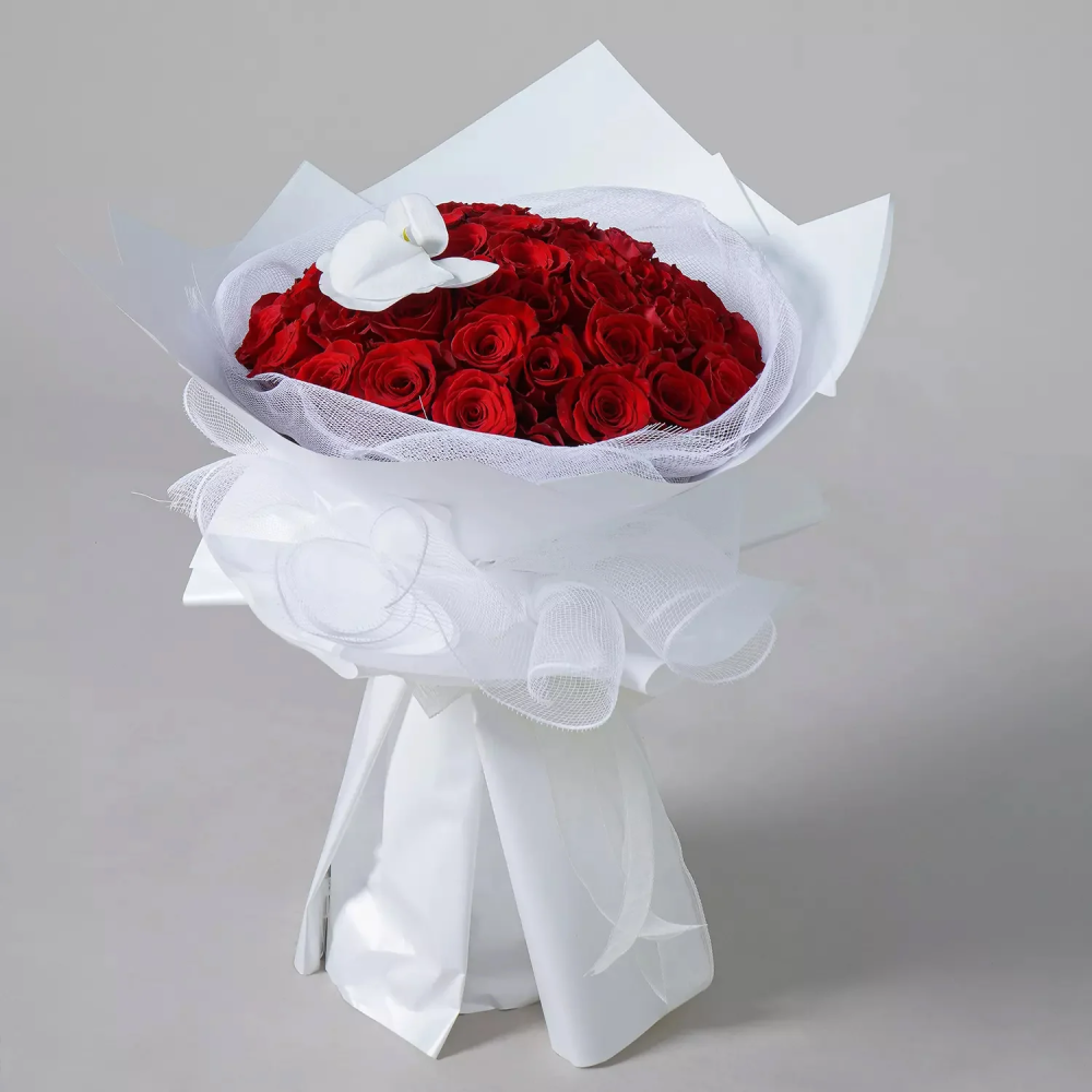 تُعد هذه الباقة الكبيرة رمزًا قويًا للمشاعر العميقة، مما يجعلها الهدية المثالية لمن تحب.